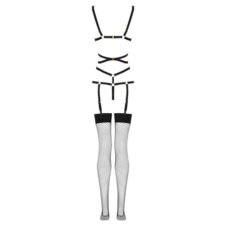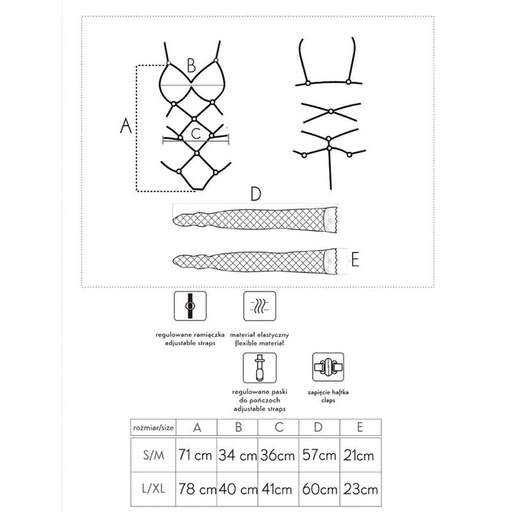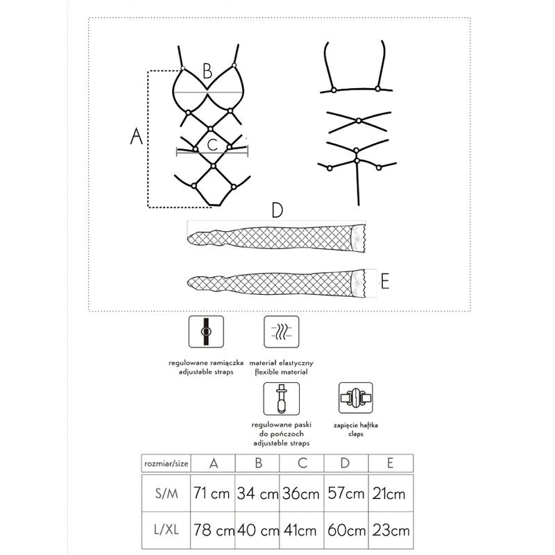 A parte superior do conjunto consiste em sexy tiras pretas, entrelaçadas na barriga e ligadas a anéis. As tiras na parte de cima envolvem elegantemente o busto sem o cobrir, enquanto na parte inferior se transformam delicadamente num fio dental. Tirinhas individuais descem dos dois lados do fio dental, abraçando encantadoramente os quadris. A parte inferior do conjunto consiste em meias pretas de comprimento ajustável, feitas de malha. As meias são presas com fechos ao elemento superior do traje, à frente e atrás.