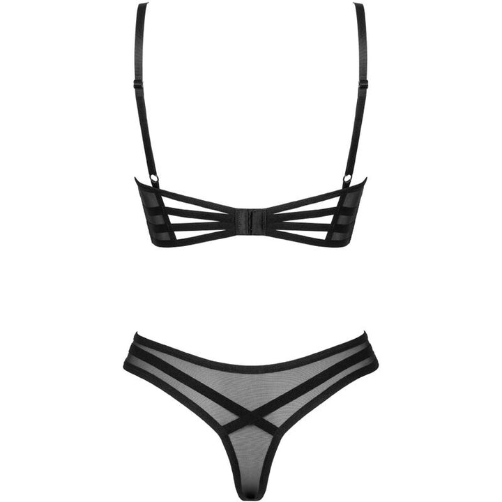 ❤ Originalidade é o seu nome do meio? Então o sutiã e a tanga Roxelia devem ir parar no seu guarda, roupa! Basta olhar para esses detalhes atraentes e design não convencional. Este conjunto fará sentir-se especial como nunca antes. Sutiã e tanga pretos. Recorte nos seios, alças e malha, detalhes excepcionais. Alças ajustáveis, fecho de vários etapas e aros, possibilidade de ajuste ergonómico. Pendente brilhante