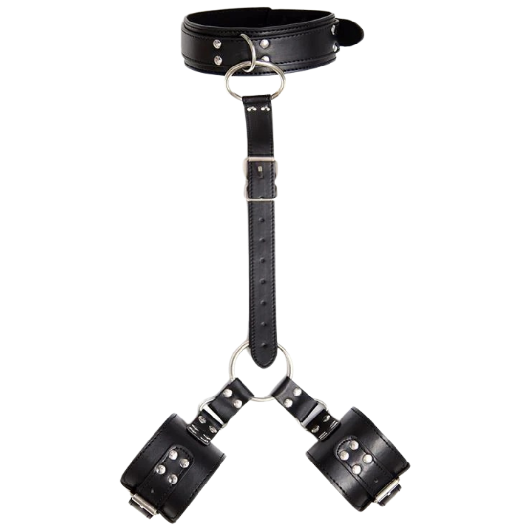 Restraint with collar and handcuffs, comfortable and adjustable. It can be used in several ways, including handcuffs attached to the collar alone so that they are on the chest area, handcuffs attached to the tape placed on the front of the body and handcuffs connected to the tape placed on the back.