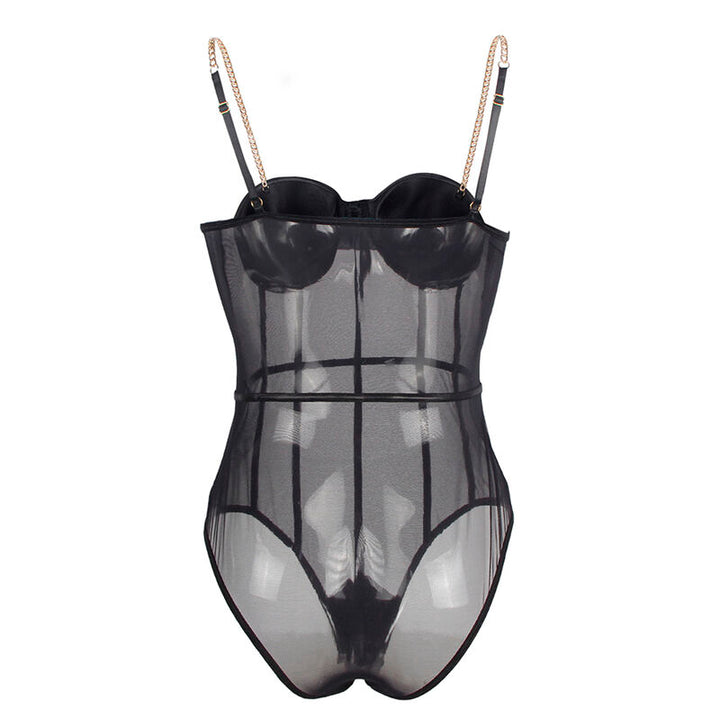 The adjustable gold chain straps and front boning offer support and a perfect fit to the body, enhancing the silhouette.