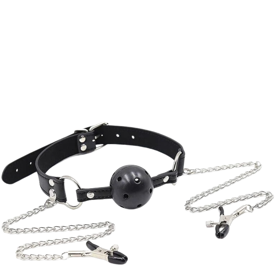 Take your BDSM games to the next level with this gag and chain set with nipple clamps. Made of soft silicone, with perforations for better breathing and fully adjustable.
