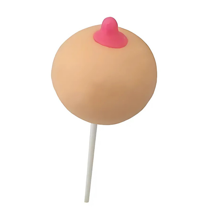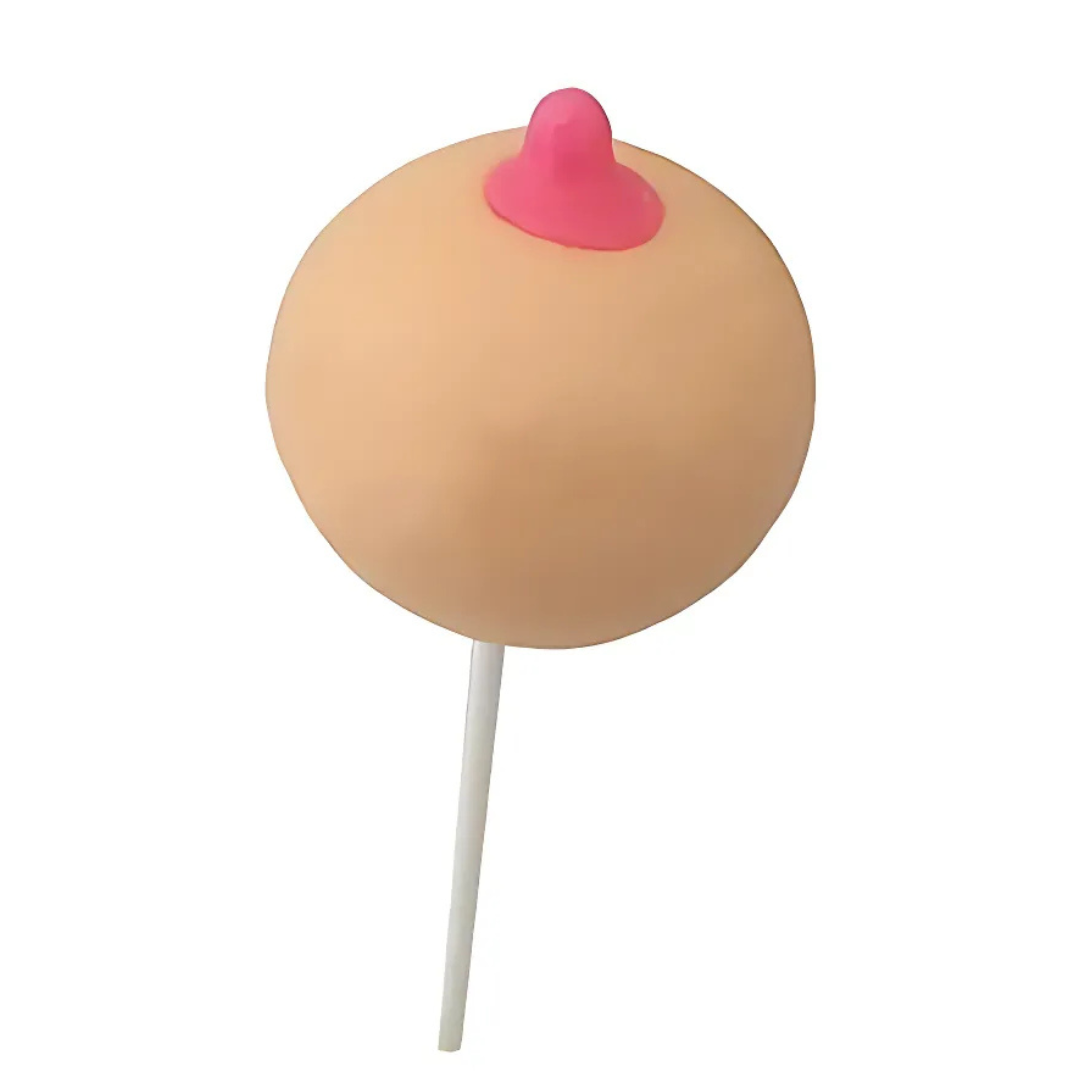 Um chupa-chupa perfeito e delicioso em forma de peito com sabor a morango. Sabor a morango.