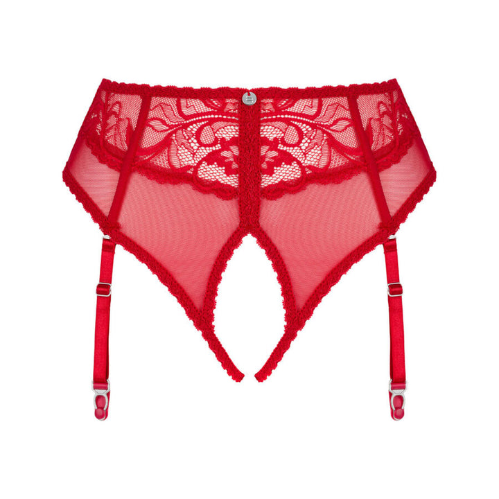 ❤ Design: Cinto de ligas em renda, com virilha aberta, destacado num vermelho ousado no cinto de ligas.
