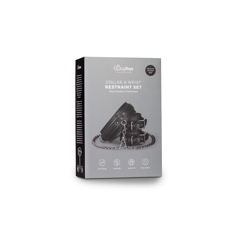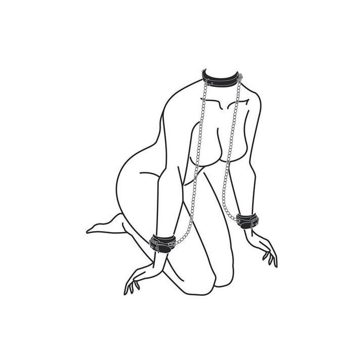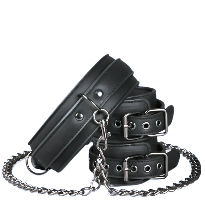 ❤ Este conjunto apresenta uma coleira e algemas de pulso com uma corrente que facilmete poderá ser colocada ou retirada e usada para várias posições de restrição. Fabricado em pele vegan, tem espuma no interior para que possa usar por quanto tempo desejar, de forma confortável. Coleira ajustável em tamanho: 45-58 cm; Pulseiras de pulso ajustáveis em tamanho: 11-28 cm; Comprimento da corrente: 40 cm.