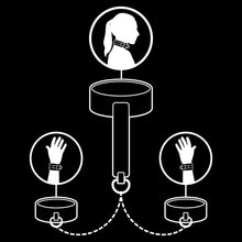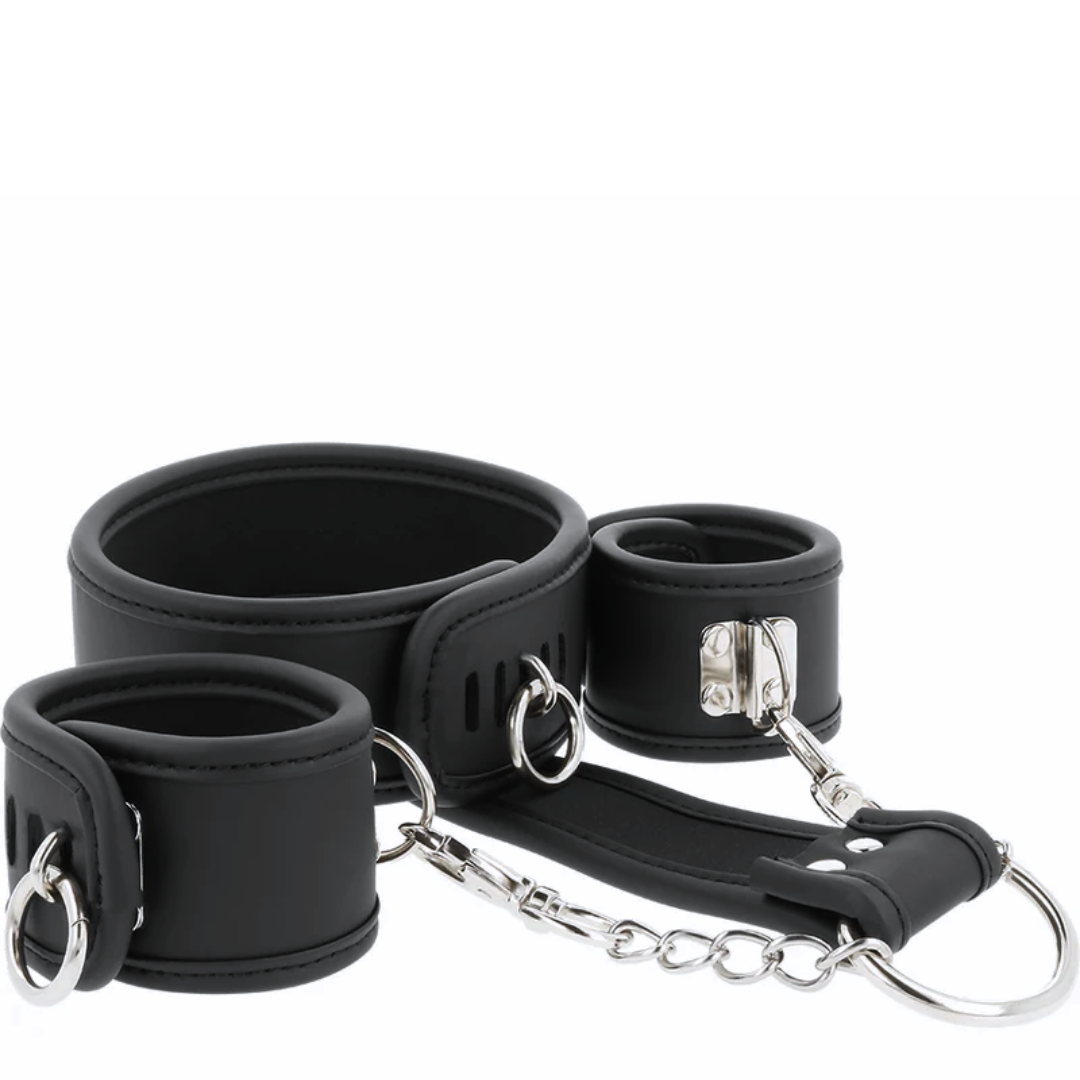 ❤ Conjunto composto por coleira de postura, fita de união com argola, corrente e algemas de pulso. Fechos universais de forma a poder utilizar os artigos em separado com qualquer outra restrição.